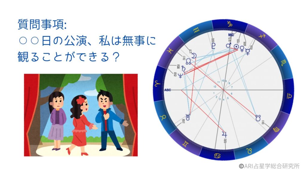 そんな状況の中で、私は3日後に観劇予定を入れていたため、どうしても状況を確認したくなり、そこで、ホラリーチャートを立ててみることにしました。